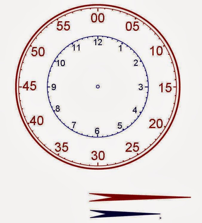 Po wprowadzeniu na tablicy dzieci otrzymują wycięte zegary i wspólnie układamy różne godziny. Wskazówki w dwóch kolorach wycinam im szersze, niż tutaj. (source)